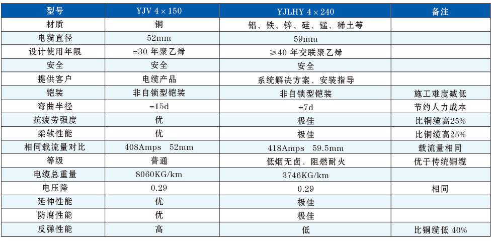 鋁合金芯電力電纜與銅或鋁芯電力電纜性能對(duì)比表
