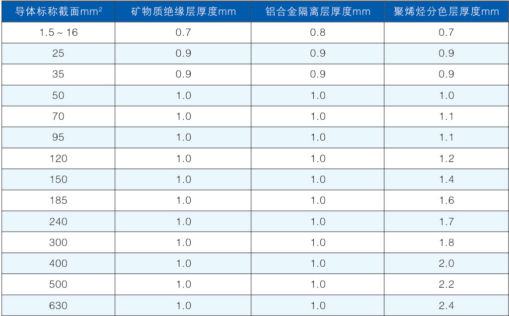 導(dǎo)體線芯的截面積、礦物質(zhì)絕緣層厚度、鋁合金隔離層的厚度和分色層厚度的關(guān)系表如下: